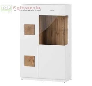 Stojąca komoda dwudrzwiowa to biała konstrukcja, w której widoczne są akcenty naturalnego drewna wotan. Przeszklona witryna sprawdzi się w przestrzeni salonu, który zyska na elegancji. Uniwersalna stylistyka sprawdzi się w stylu nowoczesnym lub skandynawskim. Komoda podzielona jest na dwie niesymetryczne części, których pojemne wnętrze pozwoli na organizację pomieszczenia.