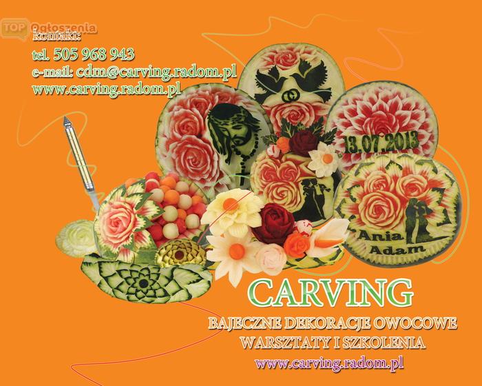 Zapewniamy wszystkie potrzebne narzędzia i materiały (owoce i warzywa) dla uczestników szkoleń. Po szkoleniu uczestnicy potrafią już wykonać kompozycje kwiatowe, ozdobić arbuza czy melona motywem kwiatowym i ułożyć z tych elementów dekoracje. Na pokazach i szkoleniach można zakupić narzędzia do carvingu, jak i książki w promocyjnych cenach. Ilość miejsc ograniczona.