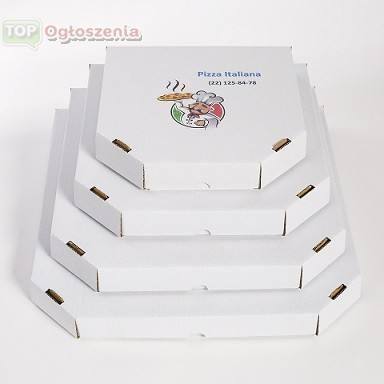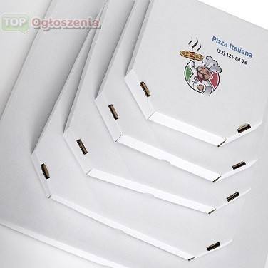 Pudełka na pizzę o wielkości 50cm, z dowolnym nadrukiem restauracji na górnej części pudełka. Opakowanie dostosowane do kontaktu z żywnością.