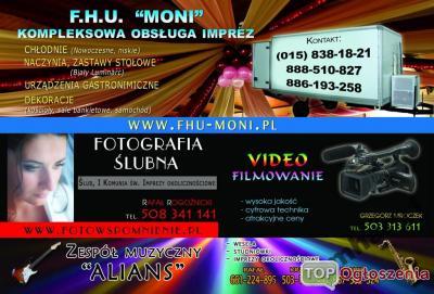 F H U "MONI" KOMPLEKSOWA OBSŁUGA IMPREZ,posiadamy naczynia(garnki i gary na 250l razem) zastawy stołowe,nowe ( biały luminarc,linia trianon) na 400 osób,białe obrusy,dwie nowoczesne niskie chłodnie dwukomorowe,(w dużej chłodni można włączyć tylko jedną komorę,oczywiście którąkolwiek, wedle potrzeb lub obie naraz),urządzenia gastronomiczne tj;taboret gazowy,patelnia elektryczna,warnik,wózek 2-funkcyjny(kelnerski,tort)dekorujemy sale bankietowe,samochód,oferujemy również usługi w zakresie : fotograf,kamerzysta,zespół muzyczny,konkurencyjne ceny,sprawdż CENA KUP TERAZ DOTYCZY ZALICZKI NA POCZET USŁUGI W WYŻEJ WYMIENIONYM ZAKRESIE,PO UPRZEDNIM KONTAKCIE TELEFONICZNYM W CELU USTALENIA WOLNEGO TERMINU TEL:888510827 , 886193258 , 015 8381821 ,dodane zdjęcia pokazują przykładową dekoracje(sali,stołu), wykonaną przez naszą firmę,rodzaj dekoracji jak i kolory są ustalane indywidualnie,według życzenia klienta,rollbar ( z chłodziarką do której można podłączyć 2-różne rodzaje piwa) jak i stół wiejski wykonany w całości z naturalnego drewna dębowego,STRONA INTERNETOWA JUŻ WKRÓTCE, ZAPRASZAMY.