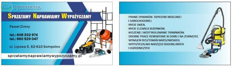 Oferujemy sprzątanie domów i mieszkań, pranie dywanów i tapicerek samochodowych,przeprowadzki.Świadcz również inne usługi wewnątrz i na zewnątrz domu. Wypożyczamy narzędzia,przyczepy i rusztowania warszawskie.Oferujemy usługi transportowe furgonetką Renault Master.Działamy w okolicach Sompolna, Konina i Koła. Cennik i szczegóły na www.sprzatamynaprawiamywypozyczamy.pl Zapraszam do odwiedzania strony.Tel 608332974